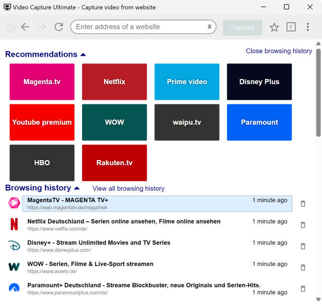 Video Capture Utimate contains a built-in browser that allows you to record videos from problematic websites (e.g. ✓ Netflix ✓ Prime Video ✓ Disney Plus.) without the result being just black, like with other capture programs.